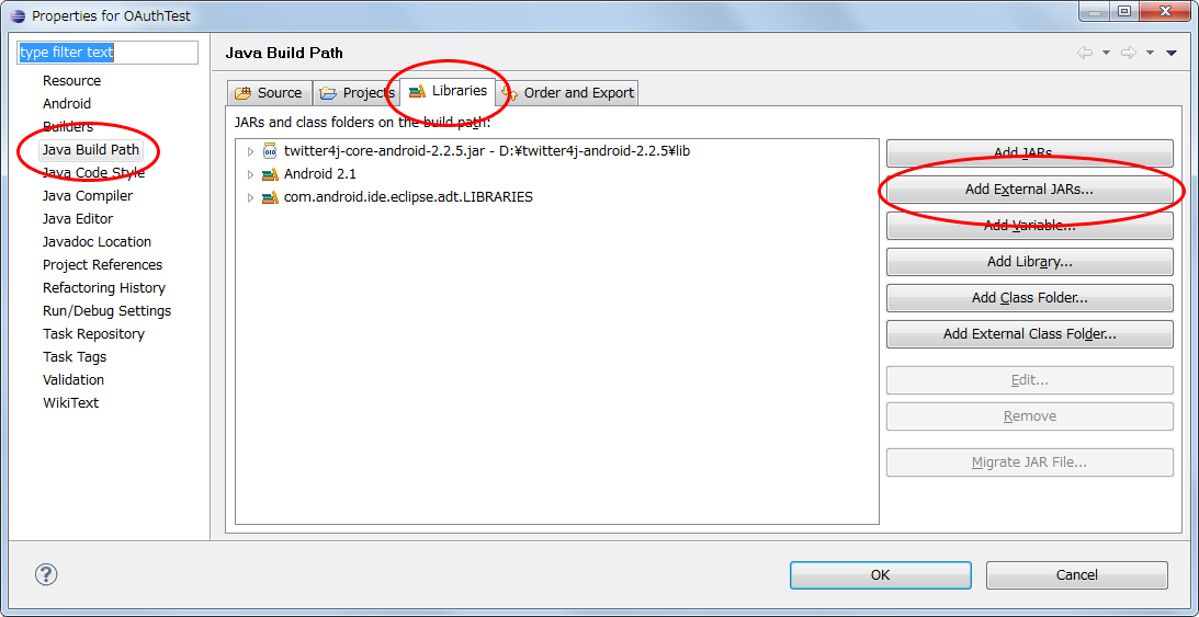 先ほど、展開したフォルダのlibフォルダ中の、twitter4j-core-android-2.2.x.jarを指定します。